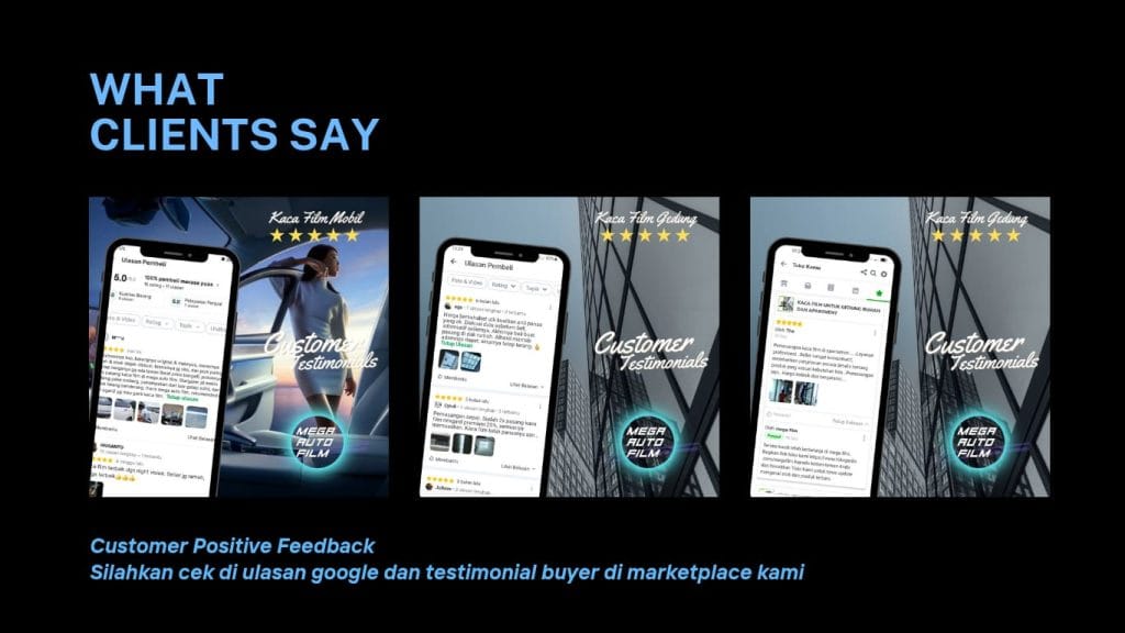 “Kami juga telah banyak memasang kaca film pada mobil untuk beberapa project jasa marga, mobil supercar dan mobil mobil listrik terbaru.”