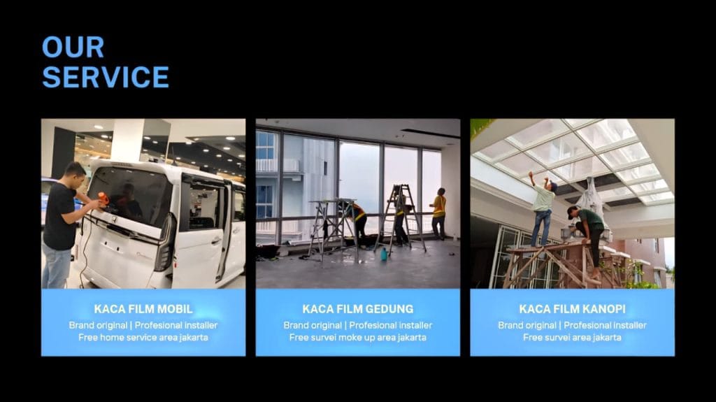 Kami adalah jasa spesialis pemasangan dan penjualan kaca film untuk mobil dan gedung di Jakarta. Kami berpengalaman dari tahun 2014 hingga kini dalam menangani berbagai project pemasangan kaca film baik di area Jakarta maupun di kota kota besar lainnya.
