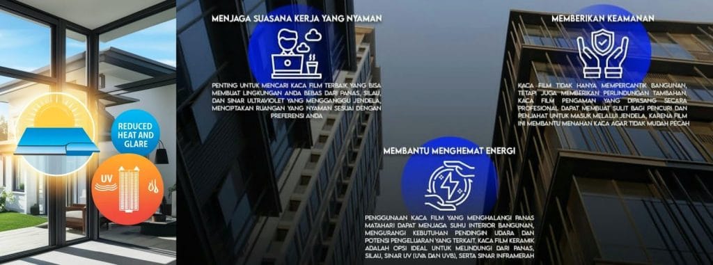 Keamanan: Untuk melindungi dari pecahan kaca akibat benturan, gunakan kaca film pengaman (safety film) yang dapat menahan kaca agar tidak berhamburan.