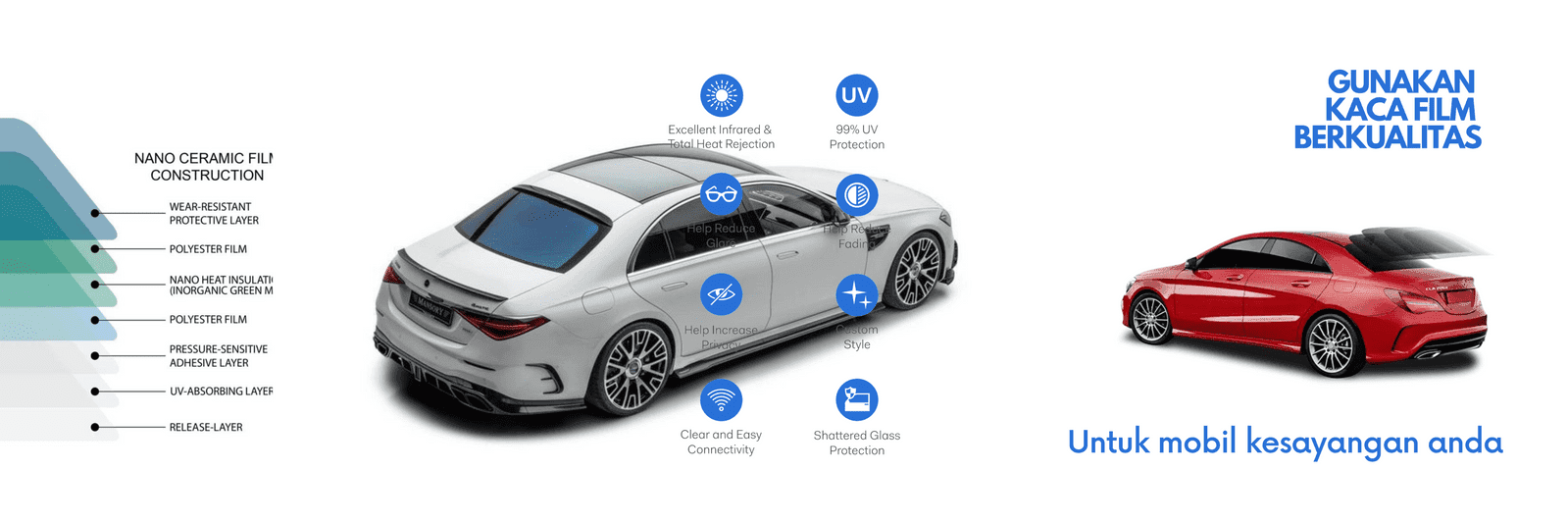 Selain itu kaca film juga berfungsi melindungi interior mobil dari kerusakan, membantu kinerja AC, dan meningkatkan penampilan serta privacy kendaraan anda.